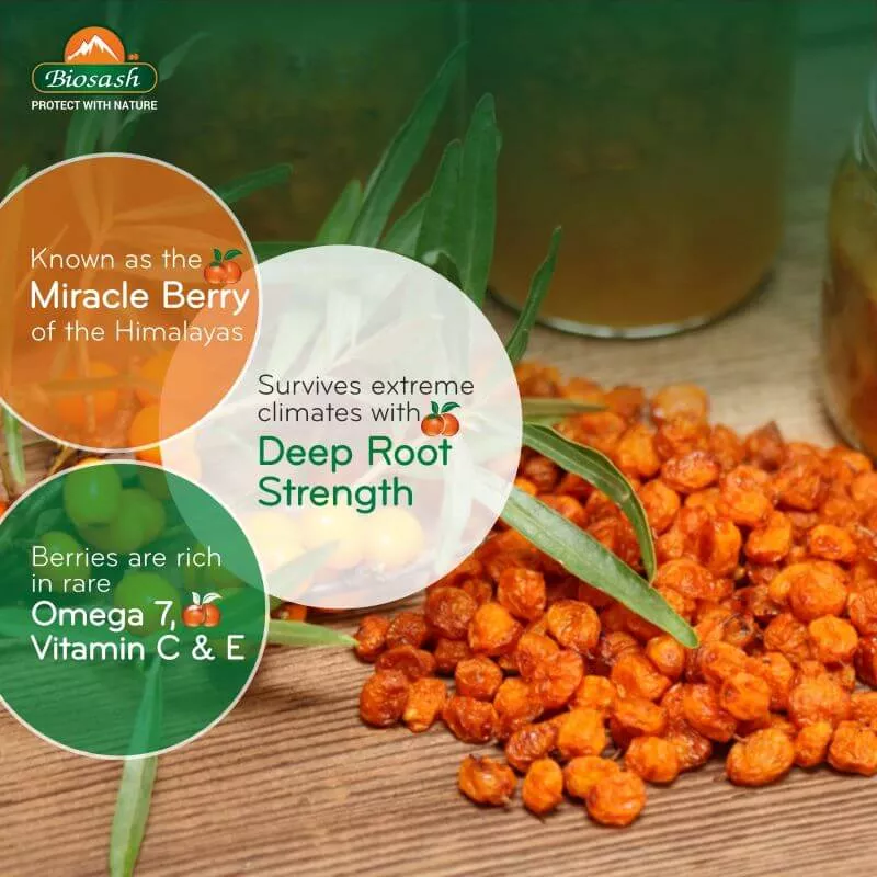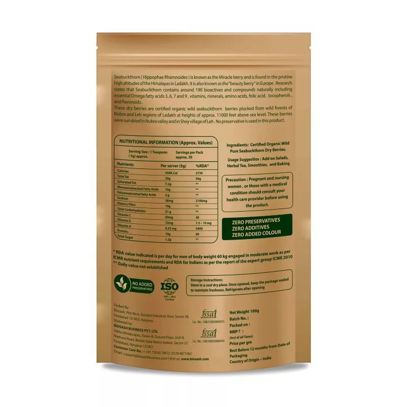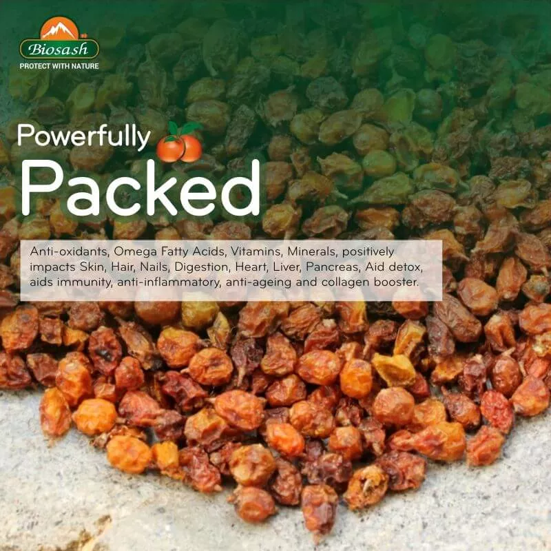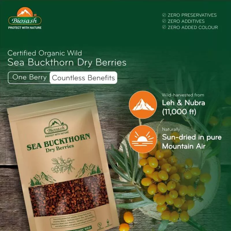 Experience the natural power of Certified Organic Wild Seabuckthorn Dry Berry (Hippophae Rhamnoides), hand-harvested from the pristine high altitudes of Nubra & Leh, Ladakh (11,000 ft). Known as the Miracle Berry in Asia and the Beauty Berry in Europe, seabuckthorn has been treasured for centuries for its incredible nutritional value and health benefits.